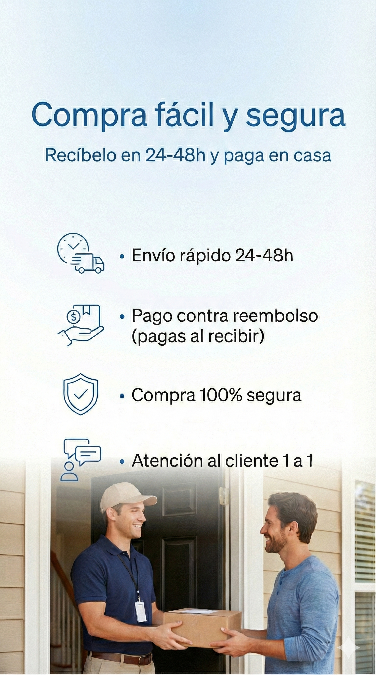 Paga solo cuando recibas tu pedido en casa. Sin pagos por adelantado, sin riesgos y con total tranquilidad.